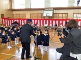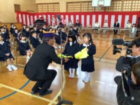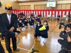 2026年4月9日(月)小杉地区と下地区、大門・大島地区の小学校8校の新一年生へ470枚のランドセルカバーを贈呈した。 贈呈式は大門小学校校の入学式で実施。 大亀会長から「命を守る大切な黄色いカバーを付けて交通安全を守って元気に学校に通って下さい」と代表の子供に手渡しました。