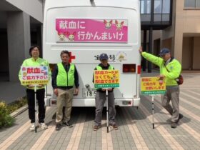 富山県立大学ボランティア部の学生と一緒に献血の呼びかけを行いました。 献血された方には、鼻セレブBOXティッシュを配布した。